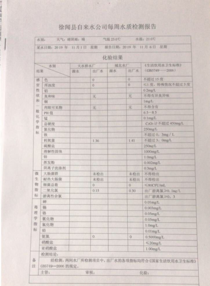 徐闻县自来水公司2019年11月份每周出厂水检测报告