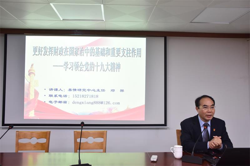 县情研究中心主任邓祥紧紧围绕习近平新时代中国特色社会主义思想这一主线,深入浅出地讲解了党的十九大提出的“新时代、新理论、新征程”以及“加快建立现代财政制度,建立权责清晰、财力协调、区域均衡的中央和地方财政关系。建立全面规范透明、标准科学、约束有力的预算制度,全面实施绩效管理”的思想,全面梳理了十九大报告的重点内容和亮点工作,并对习近平新时代中国特色社会主义思想的精神实质和丰富内涵进行了全面系统讲解,让全局财政干部职工及各财政所所长接受了一次思想洗礼。
