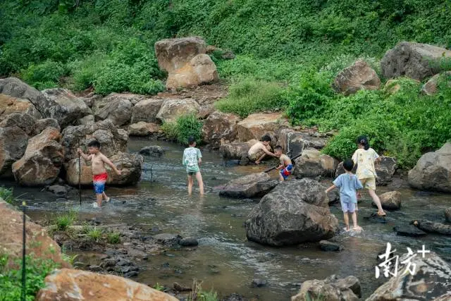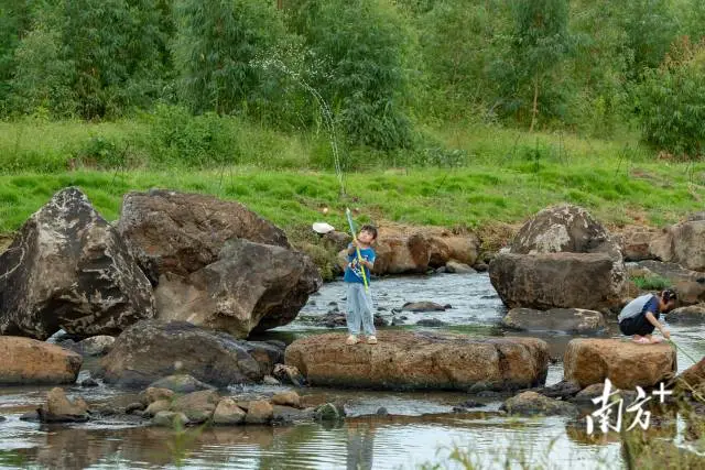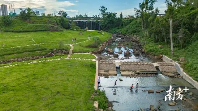 漫步至大水桥河中游段的响水潭湿地公园,飞瀑、溪流以及宽阔的草坪,原生态的石板路和玄武岩巨石造景让这里有了几分“世外桃源”的意趣。在草坪一侧,不少孩童在家长陪同下于浅溪中玩耍,河岸一侧聚拢了人间烟火气。