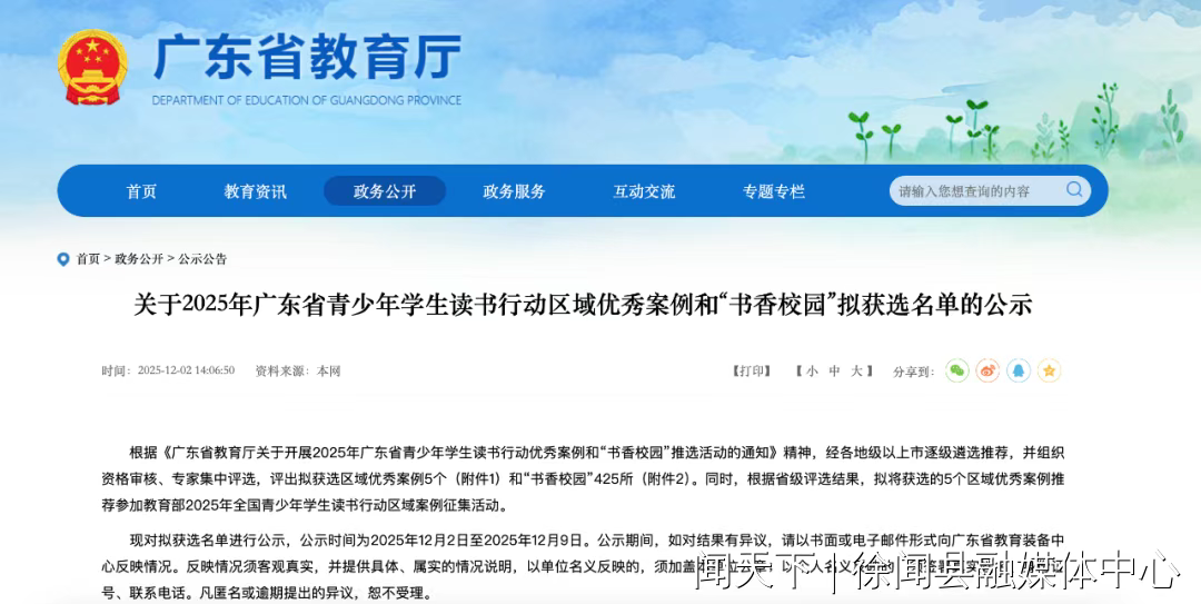 近日,广东省教育厅发布《关于2025年广东省青少年学生读书行动区域优秀案例和“书香校园”拟获选名单的公示》