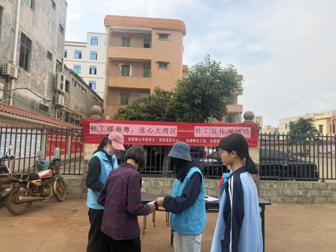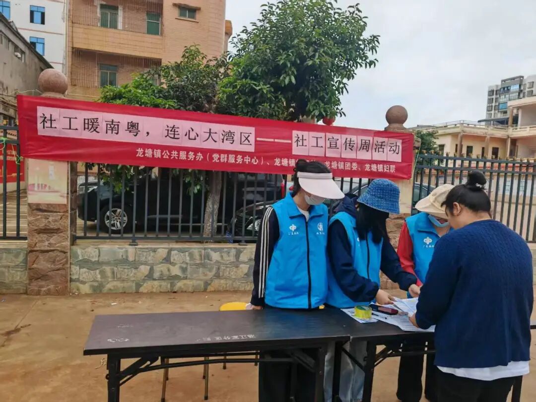 为贯彻落实湛江市有关社工周的宣传活动,为普及社工服务,不断提升社会工作的社会知晓度、认同度与影响力,大力弘扬“助人自助、专业服务”的社工理念,龙塘镇社工站结合龙塘镇实际情况于2026.3.18日上午在龙塘镇财政所门口举行了“社工暖南粤,连心大湾区——社工周宣传活动”的主题活动。