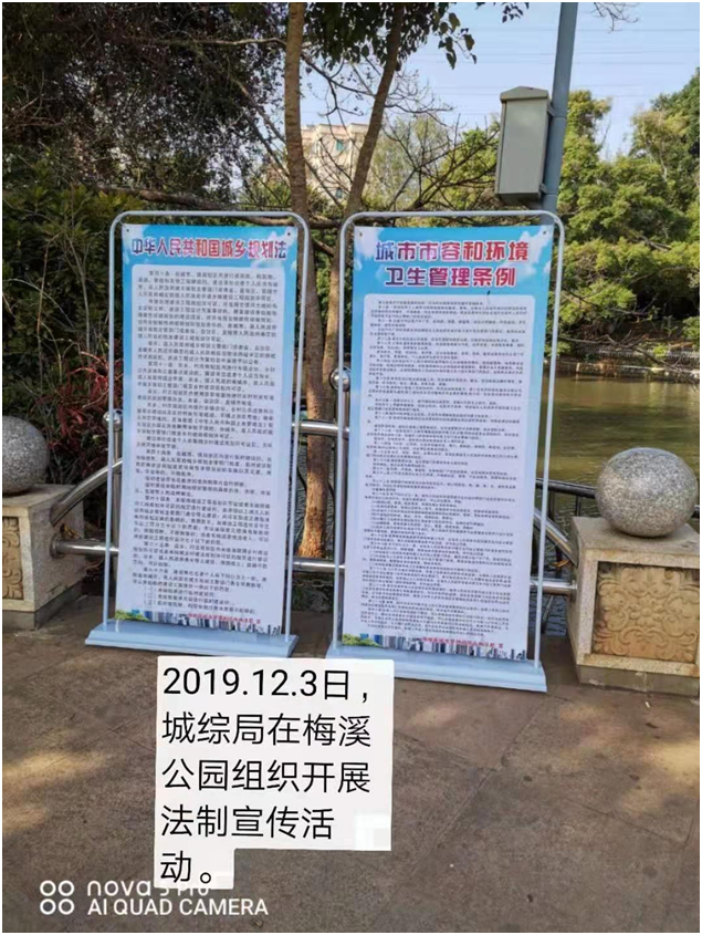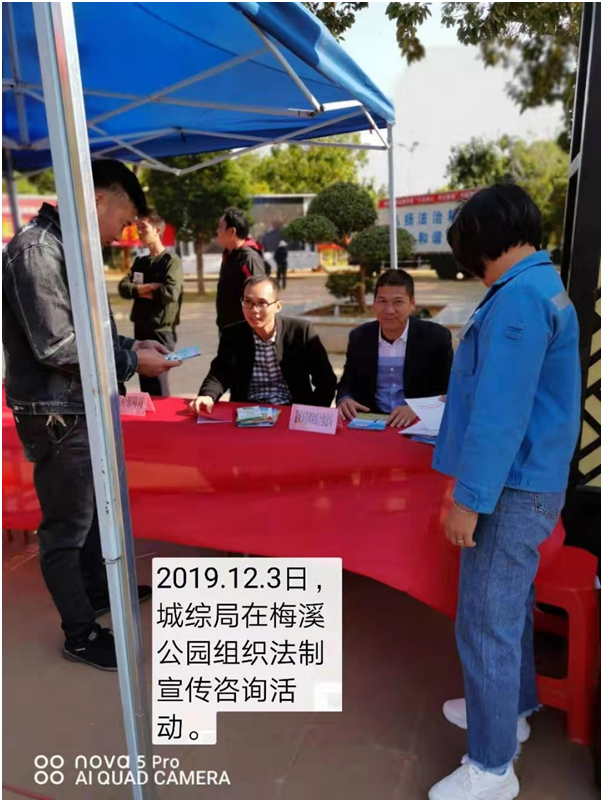 12月3日上午,城综局组织干部和执法中队人员到梅溪公园参加县司法局组织的2019年徐闻县“12·4”国家宪法日暨法制宣传日活动,并设定宣传咨询点,竖放宣传牌,宣传了《中华人民共和国城乡规划法》、《城市市容和环境卫生管理条例》、《广东省城市绿化条例》,悬挂宣传横幅,发放了宣传册子和扫黑除恶、综治平安建设等资料,群众反映良好。