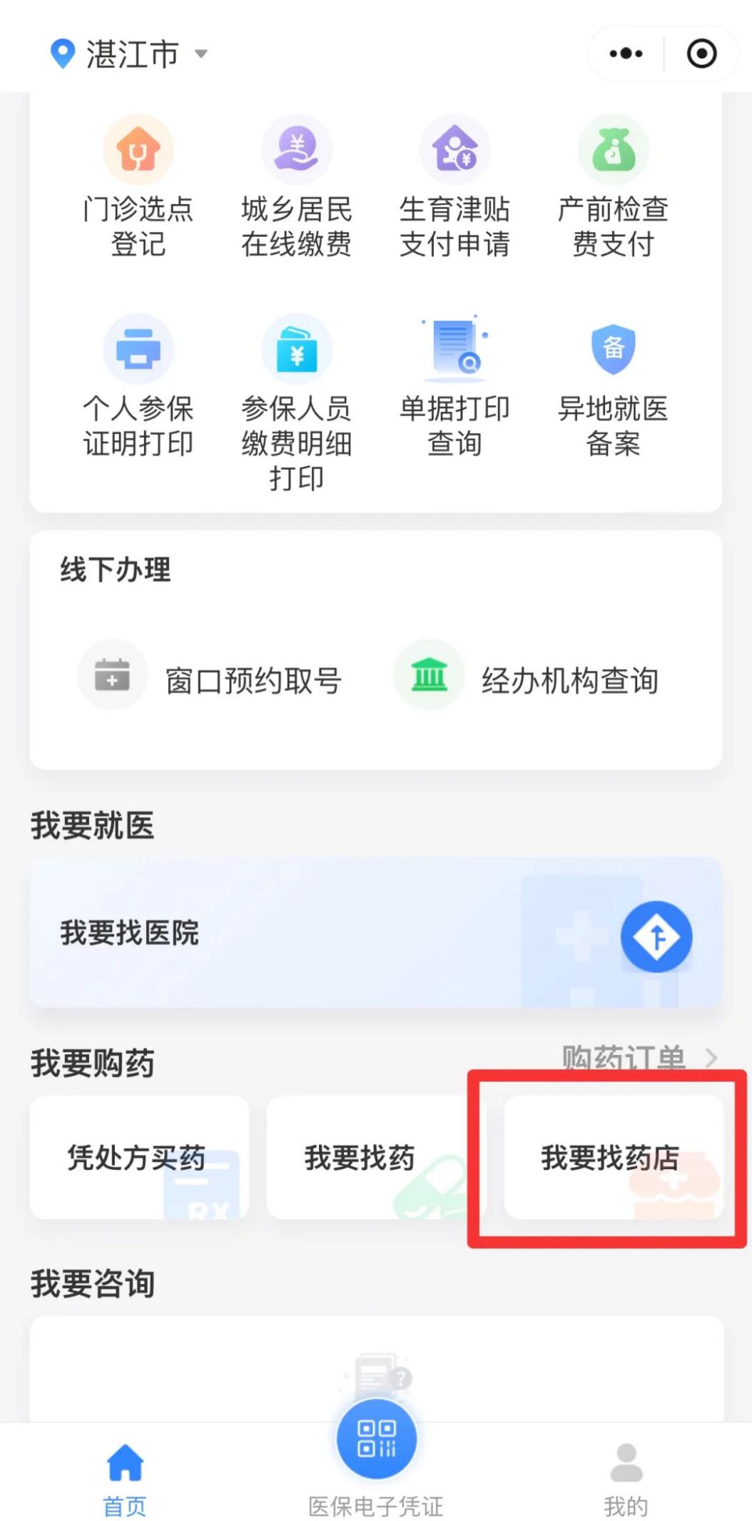在“粤医保”首页点击【我要找药店】,查看药店列表。勾选【双通道药店】可筛选出我市十家双通道药店。点击【到店购买】进入地图。
