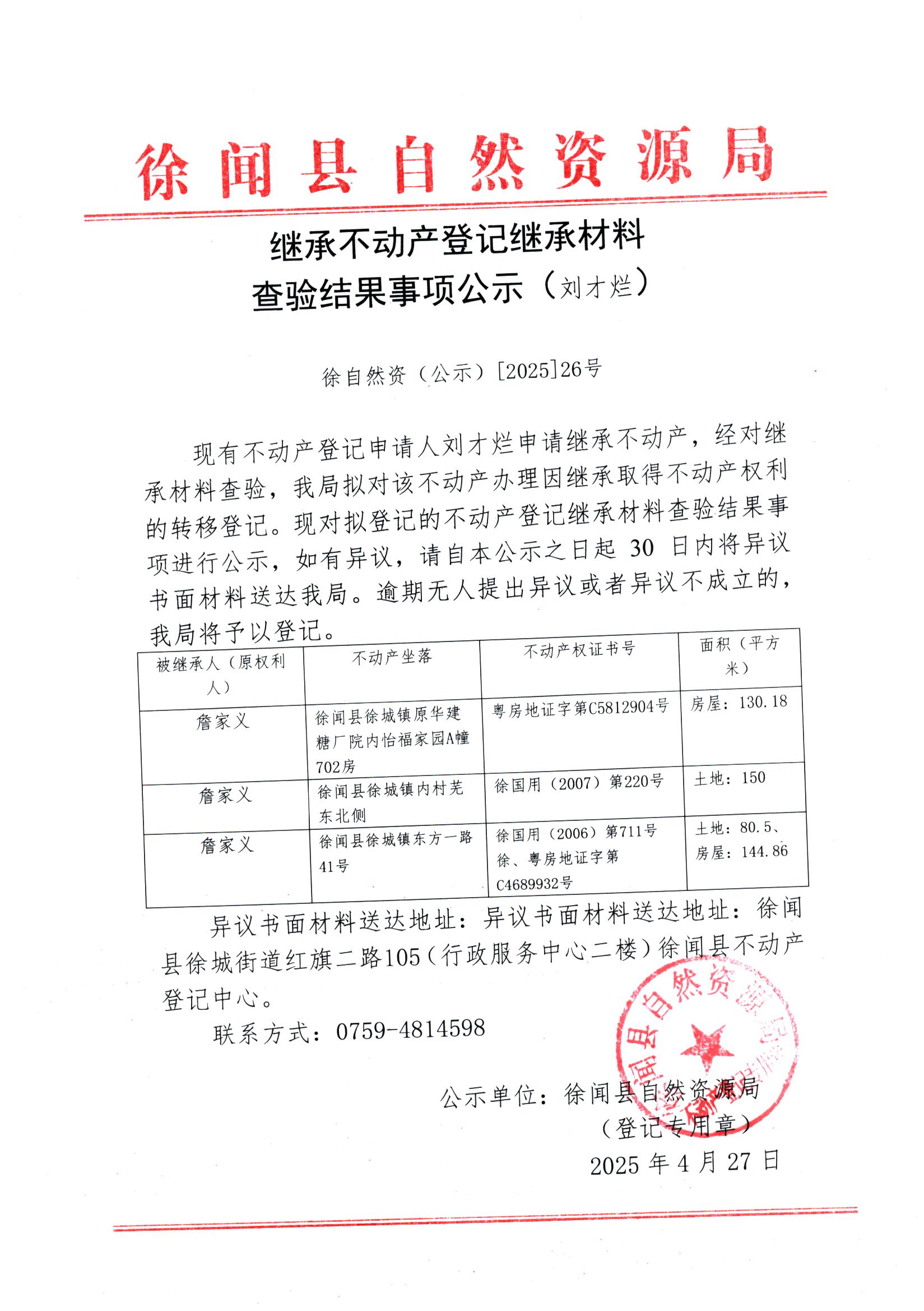 继承不动产登记继承材料查验结果事项公示(刘才烂)