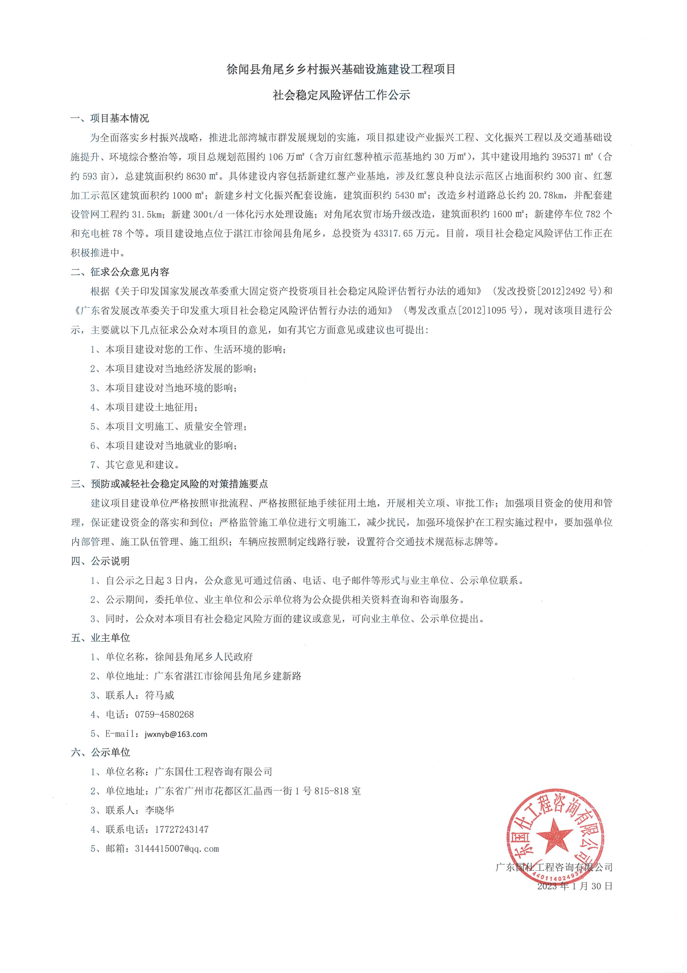 徐闻县角尾乡乡村振兴基础设施建设工程项目社会稳定风险评估工作公示