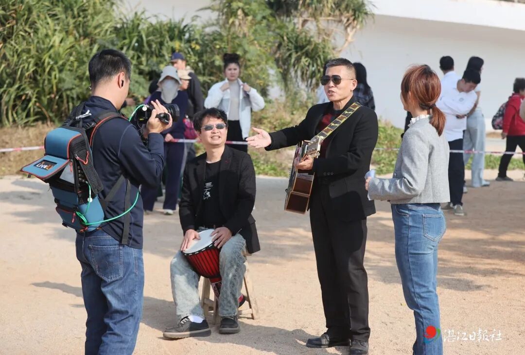 “如果有一天你感到了疲惫,带上吉他一起到角尾,这里的夜空从不需防备,只有星星静静点缀……”当天15时30分许,《一起到角尾》的悠扬旋律在直播现场响起,这首歌曲的创作者韩海冰作为新湛江人,被角尾乡独有的山海风光与人文风情深深感染,在朋友创作的歌词基础上完成了这首作品,角尾于他而言,是诗与远方的具象化表达,也让他想把这份美好通过音乐传递给更多人。直播中,雷州本土音乐人谢日忠还用方言演唱《雷州情》,将雷州半岛悠久的文化底蕴与生活里的幸福喜悦娓娓道来,民谣与雷州曲交织,让观众沉浸式感受角尾的文化魅力。在南极村的直播现场,角尾乡人民政府乡长彭幕还向全国观众热情推介了当地丰富的文旅资源。这里三面环海,拥有“大陆之角、神州之尾”的独特地理标识。北纬20°13′14″的“爱情坐标”与琼州海峡、北部湾交汇的“合水线”在此相遇,让“爱你一生一世”的浪漫成为角尾独有的文旅印记。