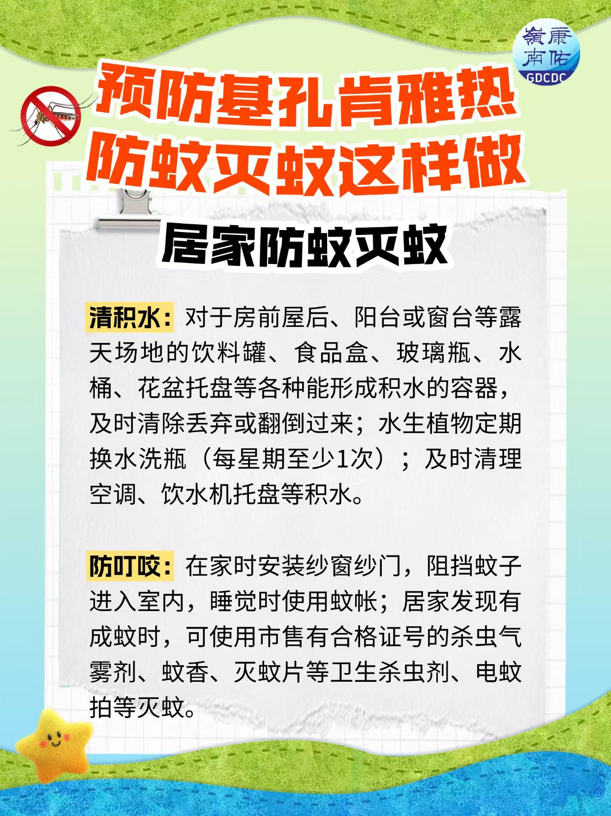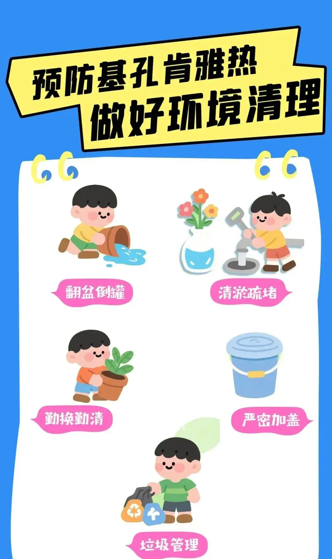 (二)小区、单位、工地等公共区域。对室内外孳生地进行清理,重点关注绿化带、停车场、垃圾或杂物暂存点、地下车库集水井、排水沟、楼梯间、楼房反墚及雨水沟、建筑物凹陷处等,主要采取清理卫生死角、翻盆倒罐、沙土填埋、投放灭蚊幼剂等方式。
