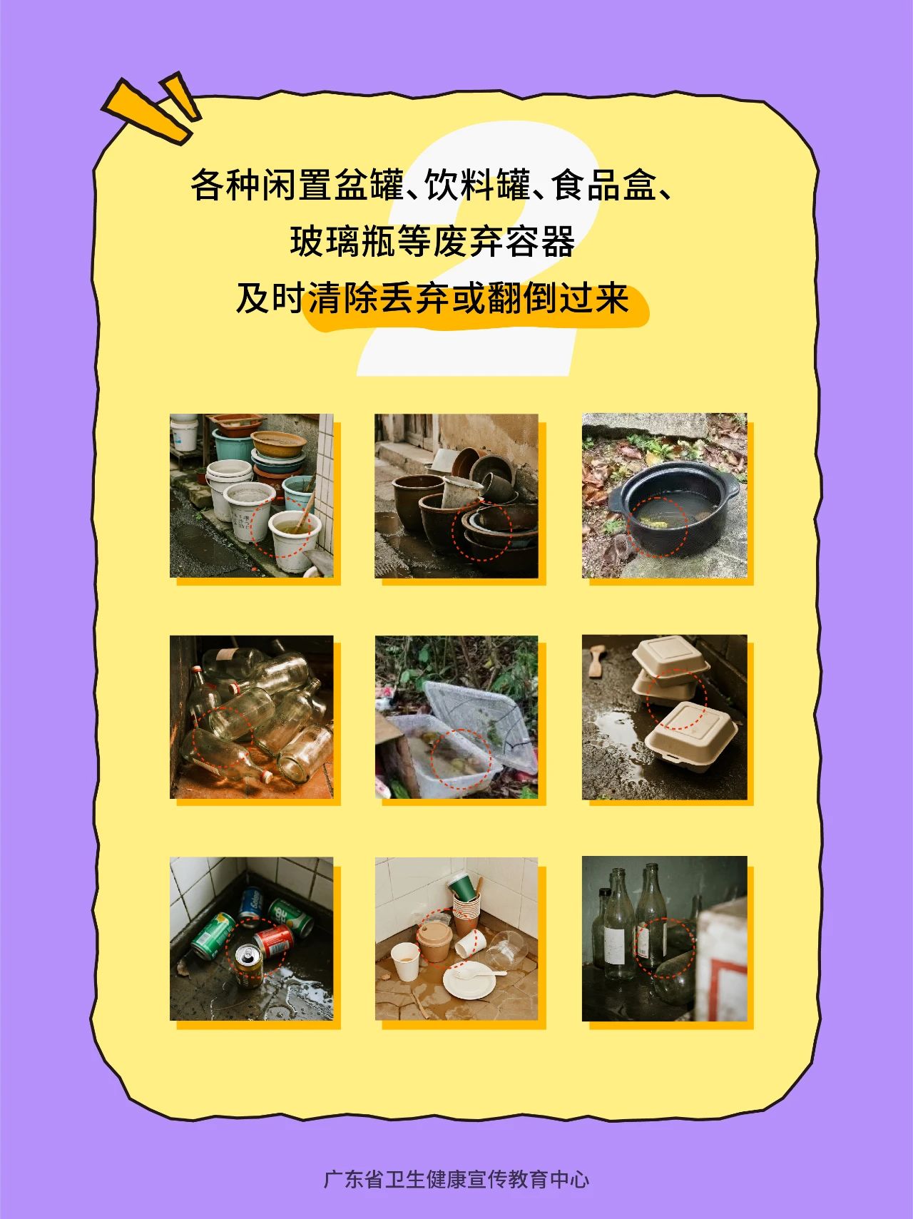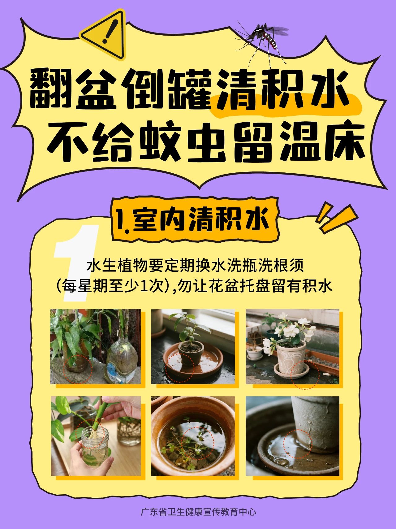 (一)家庭及个人工作场所。重点关注水生植物、花盆托盘、水桶、闲置瓶罐、储水缸、院内排水沟等,主要采取翻盆倒罐、加盖、水培改为沙土种植植物、疏通水沟、投放灭蚊幼剂等方式。