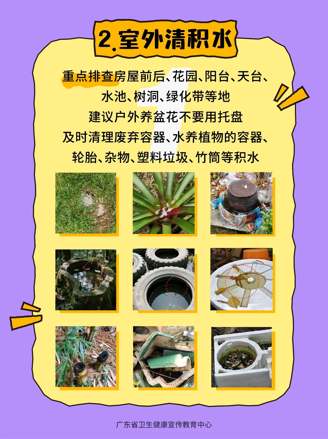 (三)天台、阳台及门前屋后积水管理。屋顶反墚、排水槽等应定期疏通,避免堵塞积水。阳台、天台、庭院内的花盆、泡沫箱、废弃瓶罐等容器应及时清理,闲置容器应倒扣放置,储水容器如水缸应加盖,废弃容器彻底清除。竹筒、树洞应进行封堵或改造,莲花池养鱼防蚊。空调冷凝水应及时排净,废弃轮胎在底部打孔或避免露天放置。下水井进行防蚊封堵,有条件的建议将明沟改为暗渠。