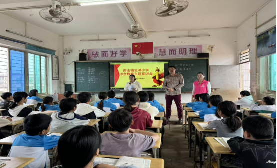 为深入贯彻落实中央对台工作大政方针,切实增进青少年对台湾问题的正确认知、厚植家国情怀,我镇近期精准施策开展涉台教育进校园系列活动。针对青少年群体认知特点,我镇坚持差异化宣讲导向,打破传统课堂教学模式,创新采用生动活泼的动漫视频教学形式提升教育实效。12 月 10 日,镇统战干部与志愿者组成宣讲队伍走进北潭小学,以沉浸式、互动性的宣讲方式推动涉台知识入脑入心,有效筑牢青少年维护领土完整的思想根基。
