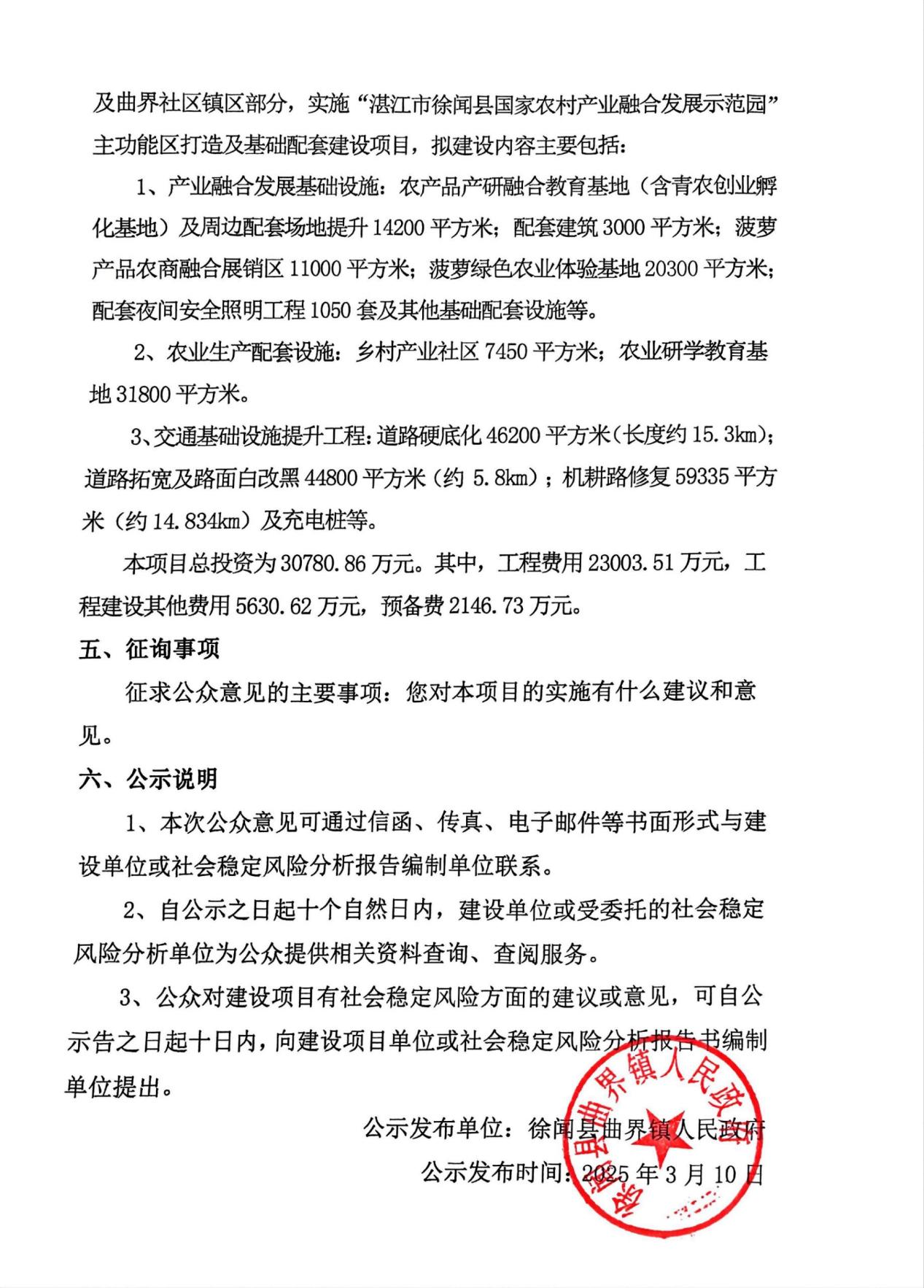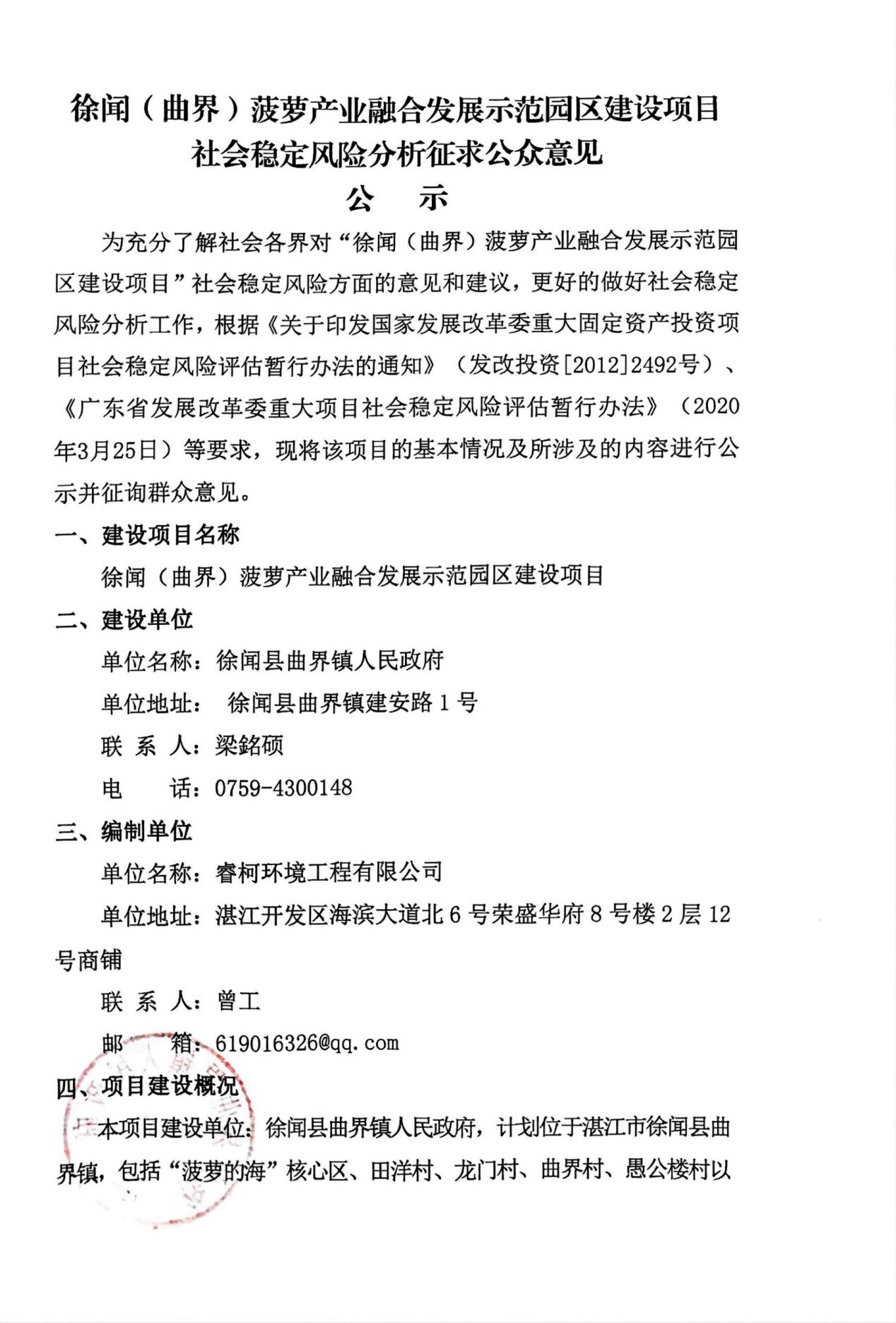 徐闻(曲界)菠萝产业融合发展示范园区建设项目社会稳定风险分析征求公众意见公示