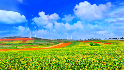 奔跑在风车赛道,听着风声呼啸穿过耳边,曼妙的旋律,涤荡身心,美景盈满眼眸,享受难得的放松惬意!而耸立的风车,宛如一根根擎天柱屹立在田园直插云端,也给美丽的田园带来了一道亮丽的风景线。