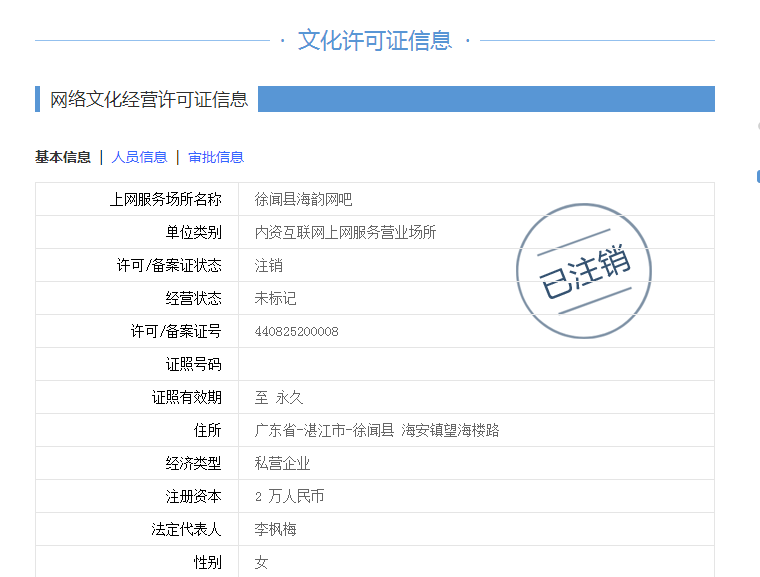 徐闻县海韵网吧(广东省徐闻县海安镇海安大道72号)向我局申请注销《网络文化经营许可证》,根据《行政许可法》及《互联网上网服务营业场所管理条例》的有关规定,现同意办理注销手续,其《网络文化经营许可证》(编号440825200008)即时作废。